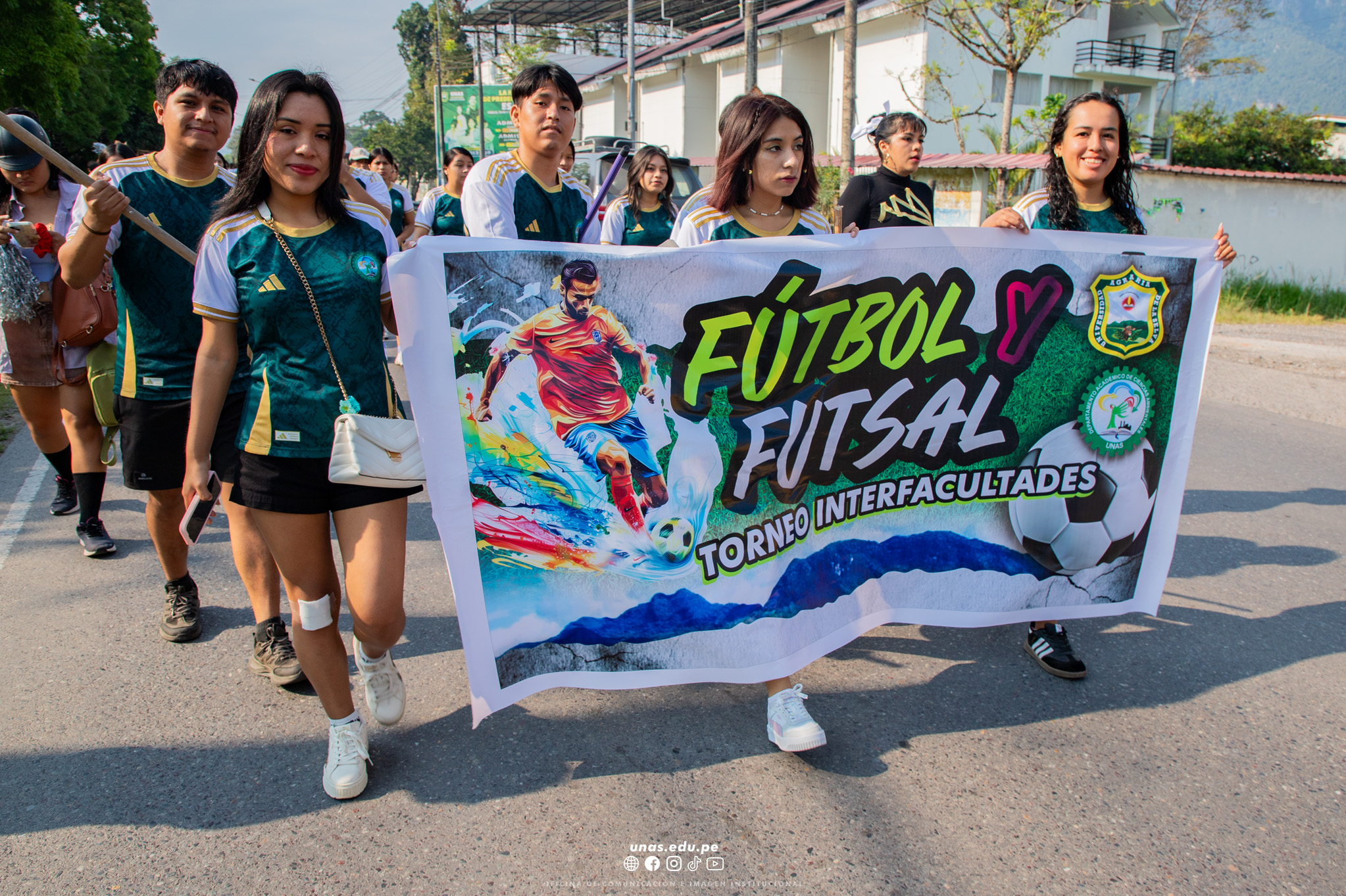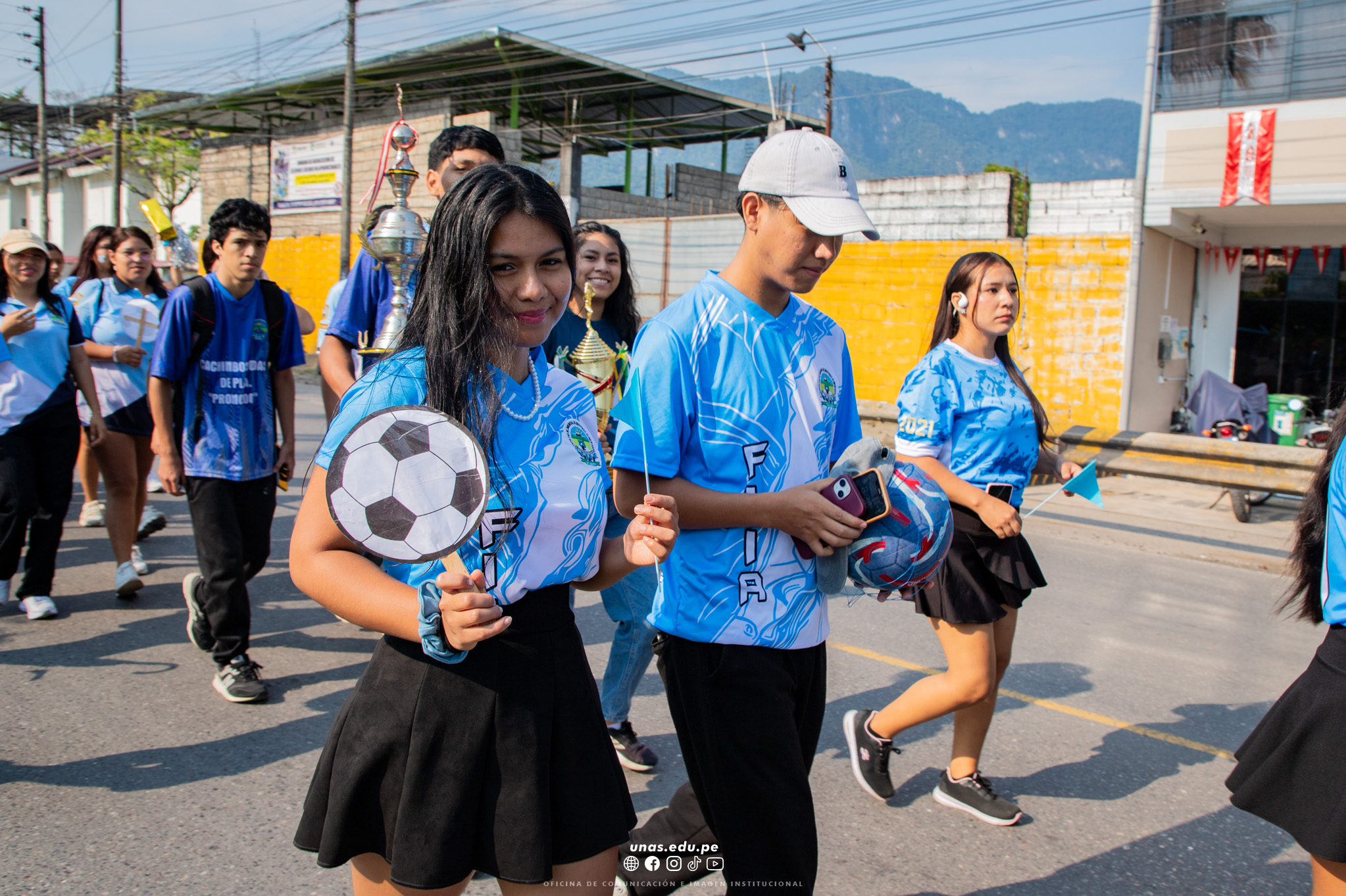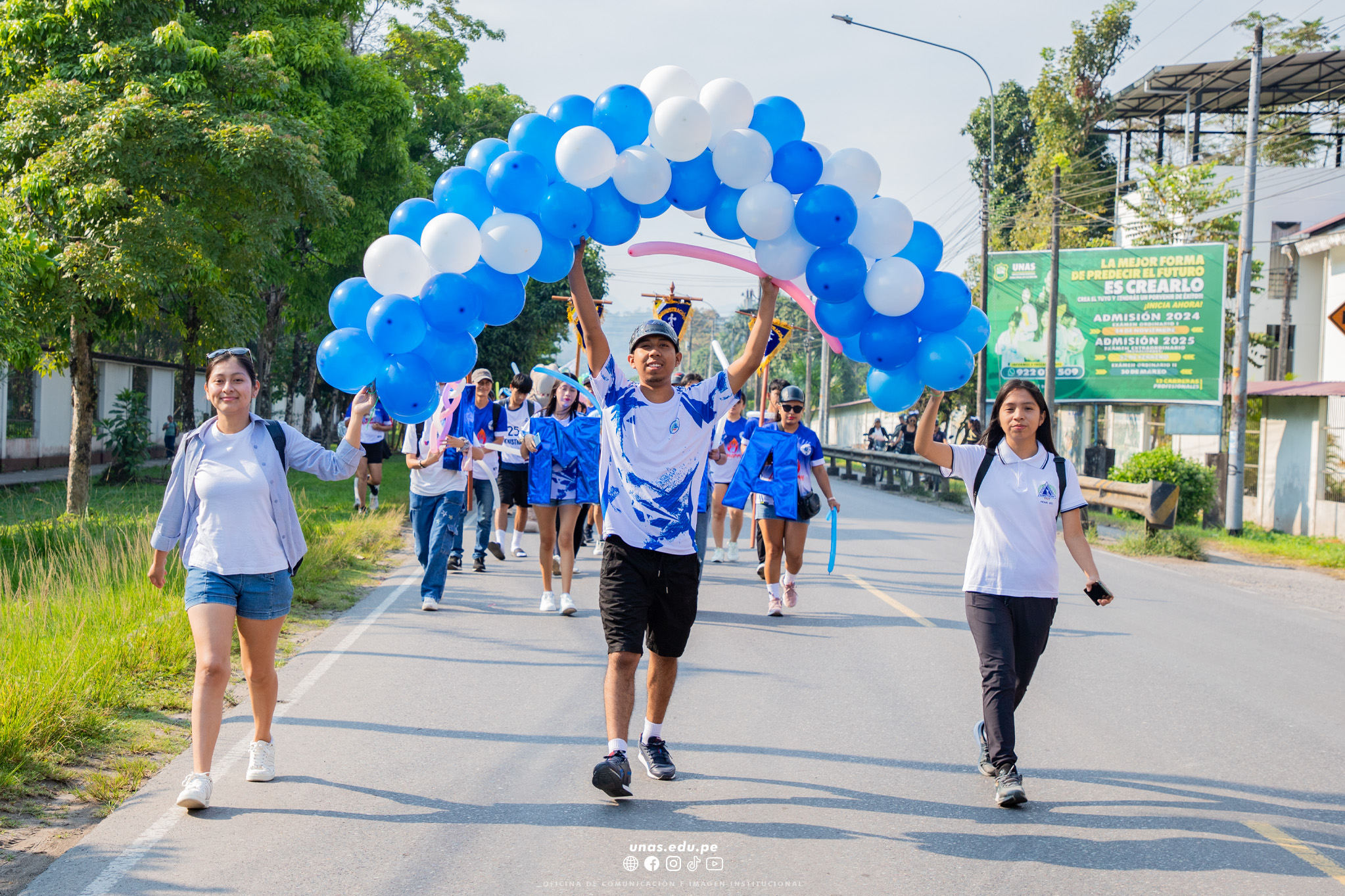 ๐ŸŸขLa comitiva fue encabezada por el presidente de la comisiรณn organizadora, Dr. Medardo Dรญaz Cรฉspedes, junto a la junta directiva y las autoridades de la UNAS, quienes portaron la banderola general durante todo el recorrido. La batucada universitaria animรณ el evento, generando gran entusiasmo entre los vecinos de Tingo Marรญa, que expresaron su apoyo con fuertes aplausos.