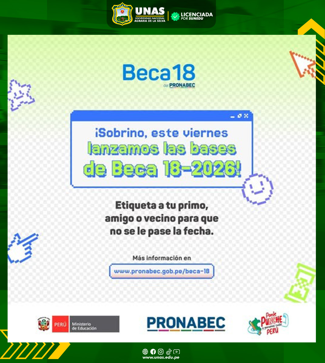 ๐ขLa UNAS invita a los estudiantes del quinto aรฑo de secundaria y a egresados de educaciรณn bรกsica regular a participar en el concurso de Beca 18, cuya etapa de postulaciรณn se realizarรก del 8 de setiembre al 5 de octubre, a travรฉs del portal oficial ๐