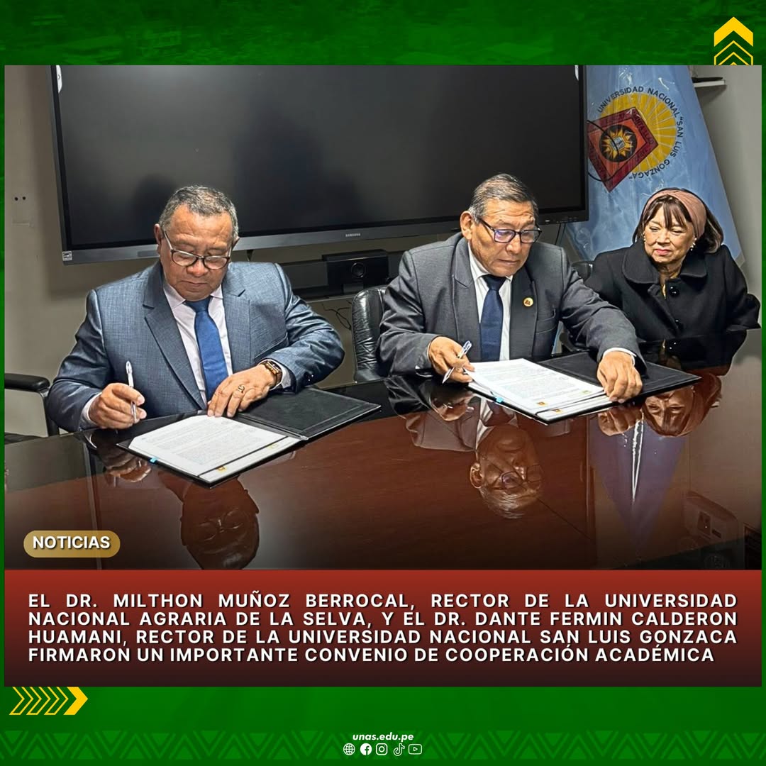 El ๐๐ฟ. ๐ ๐ถ๐น๐๐ต๐ผ๐ป ๐ ๐๐ปฬ๐ผ๐ ๐๐ฒ๐ฟ๐ฟ๐ผ๐ฐ๐ฎ๐น, Rector de la UNAS – Universidad Nacional Agraria de la Selva, y el ๐๐ฟ. ๐๐ฎ๐ป๐๐ฒ ๐๐ฒ๐ฟ๐บ๐ถฬ๐ป ๐๐ฎ๐น๐ฑ๐ฒ๐ฟ๐ผฬ๐ป ๐๐๐ฎ๐บ๐ฎ๐ป๐ถฬ, Rector de la Universidad Nacional ยซSan Luis Gonzagaยป, firmaron un importante Convenio de Cooperaciรณn Acadรฉmica.