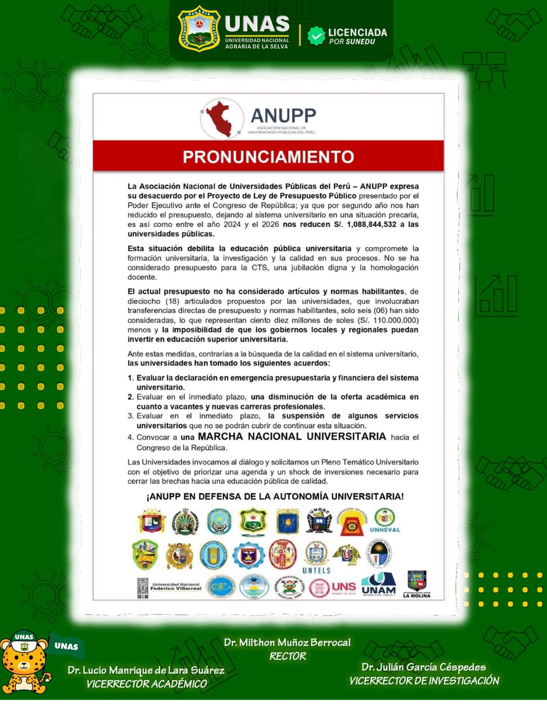 🟢En un comunicado oficial, la ANUPP advirtió que el recorte presupuestario debilita directamente a las universidades públicas del país, afectando su capacidad para mantener su oferta académica y garantizar servicios esenciales para los estudiantes.