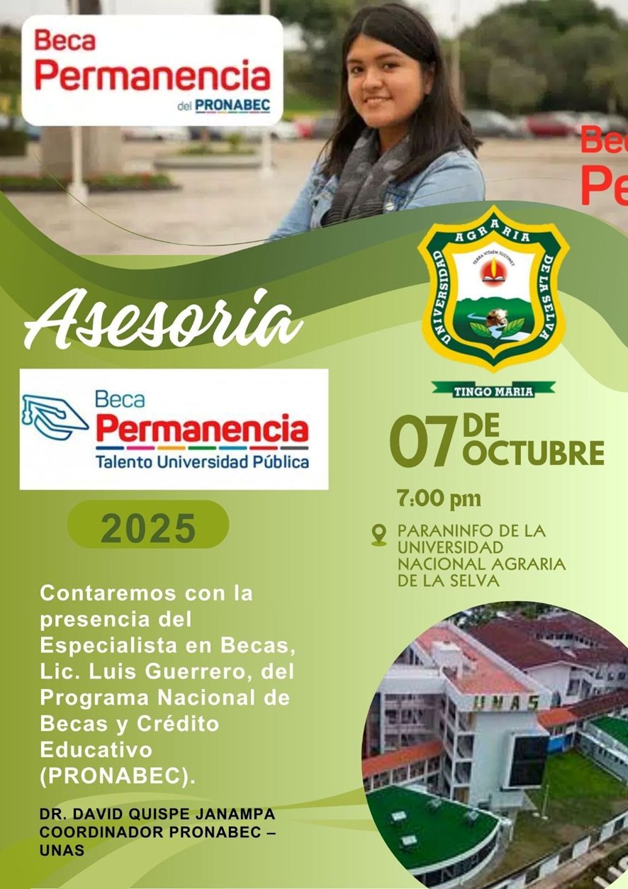La Universidad Nacional Agraria de la Selva (UNAS) invita a los estudiantes de las promociones 2022, 2023, 2024 y 2025 a participar en una reunión informativa sobre la Beca Permanencia – Convocatoria 2025, organizada en coordinación con el Programa Nacional de Becas y Crédito Educativo -PRONABEC-.
