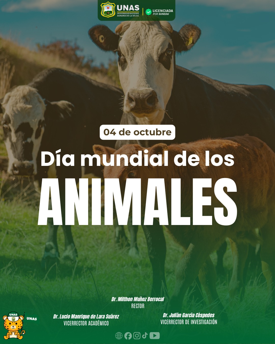 Saludamos en esta fecha especial el Día Mundial de los Animales, reafirmando nuestro compromiso con la protección, el cuidado responsable y la preservación de todas las especies que forman parte esencial de nuestro ecosistema. Como institución, renovamos nuestro llamado a la conciencia y al respeto hacia la vida animal, promoviendo una convivencia armónica y sostenible entre el ser humano y la creación que nos rodea.
