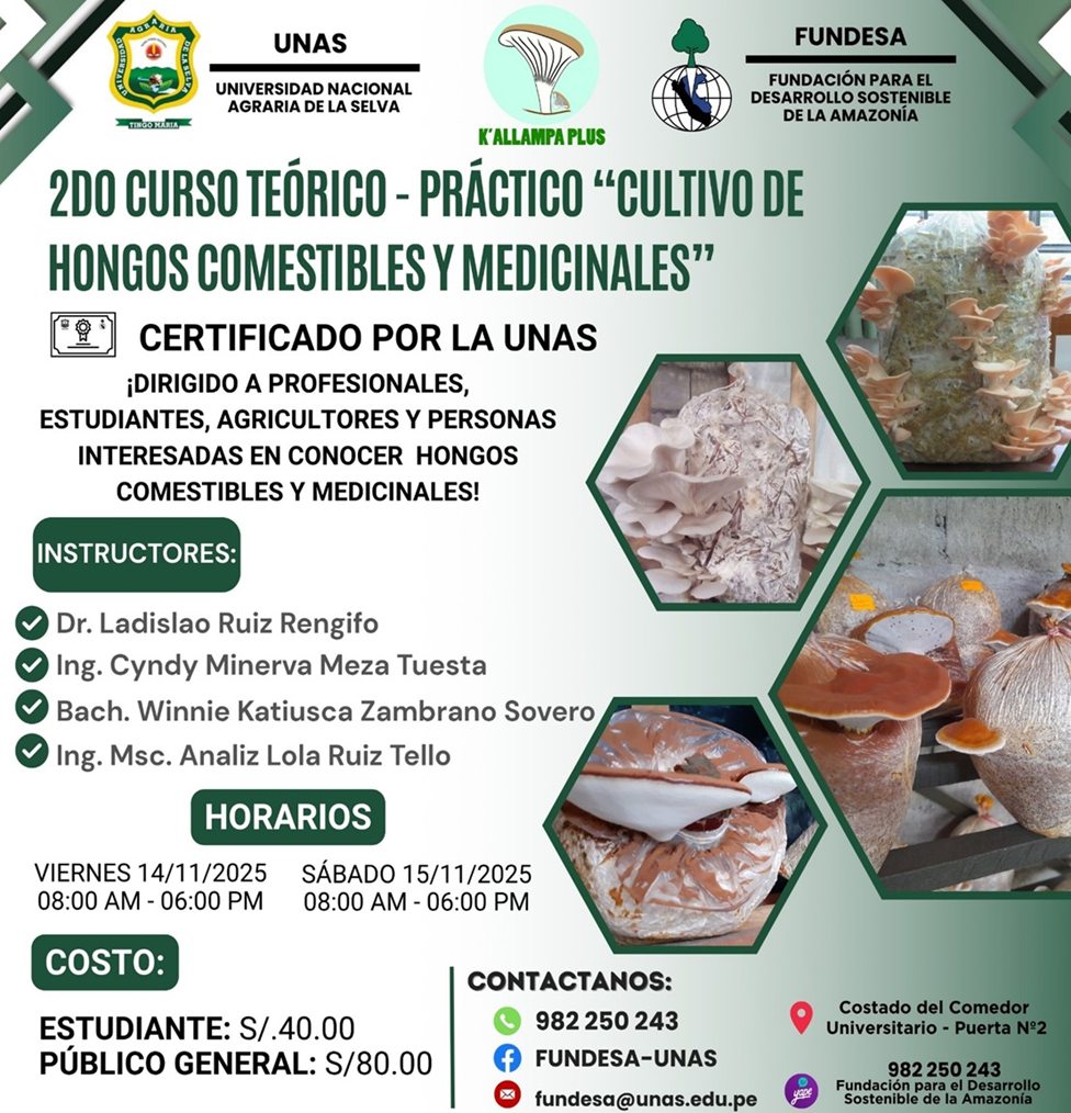 🟢La Universidad Nacional Agraria de la Selva -UNAS-, en alianza estratégica con la Fundación para el Desarrollo Sostenible de la Amazonía -FUNDESA- y con el respaldo técnico de Kallampa Plus, anuncian la realización del Segundo Curso Teórico–Práctico “Cultivo de Hongos Comestibles y Medicinales”.