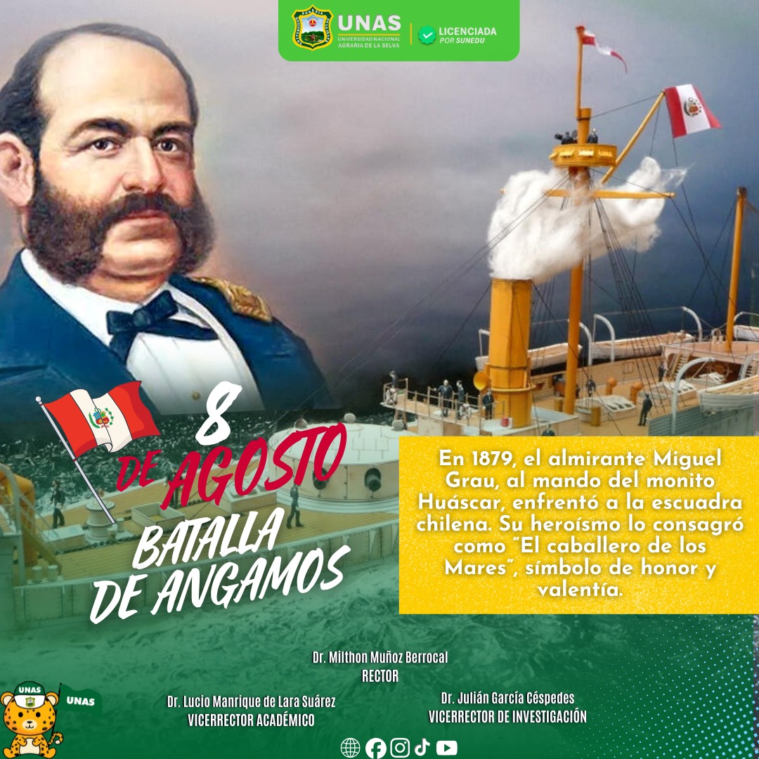Las autoridades de la Universidad Nacional Agraria de la Selva expresan su más profundo homenaje al conmemorarse el Combate de Angamos, recordando el heroísmo del Almirante Miguel Grau Seminario, ejemplo de valor, patriotismo y entrega al deber. En este día, reafirmamos nuestro compromiso con los valores que él encarnó: el amor a la patria, la integridad y el sacrificio por el bienestar de todos los peruanos.