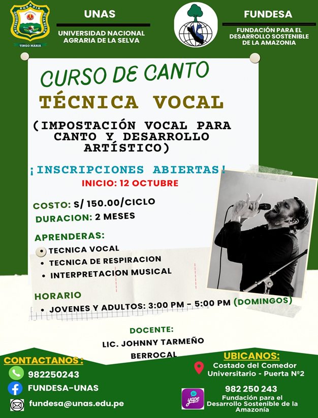 🟢La Universidad Nacional Agraria de la Selva (UNAS), en coordinación con la Fundación para el Desarrollo Sostenible de la Amazonía (FUNDESA), ha anunciado la realización del curso de Técnica Vocal, dirigido a jóvenes y adultos interesados en perfeccionar sus habilidades en el canto.