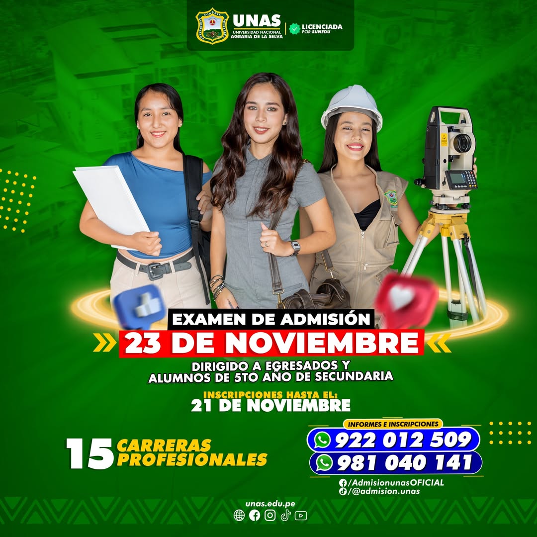 🟢La Dirección de Admisión de la Universidad Nacional Agraria de la Selva (UNAS) anunció oficialmente la realización del Examen de Admisión Ordinario para el próximo 23 de noviembre de 2025, invitando a todos los jóvenes del país a postular a esta casa superior de estudios.