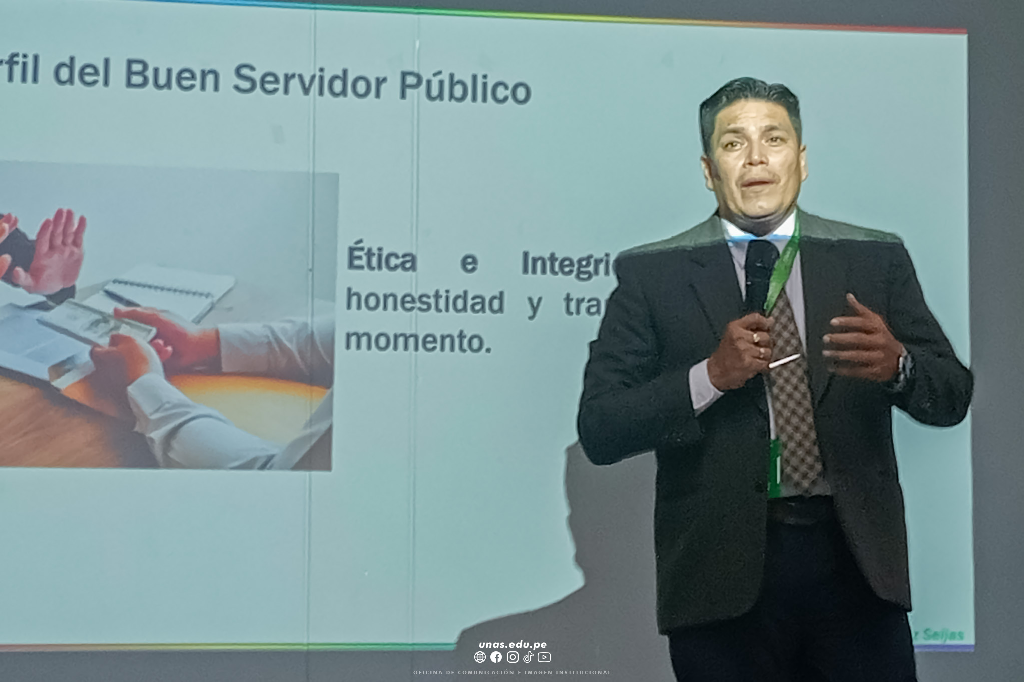 🟢La actividad contó con la ponencia del Mg. Morty Díaz Seijas, docente de la carrera profesional de Administración, quien destacó la importancia de que el servidor público actúe con legalidad, lealtad, honradez e imparcialidad, contribuyendo así al fortalecimiento institucional y al bienestar de la sociedad.