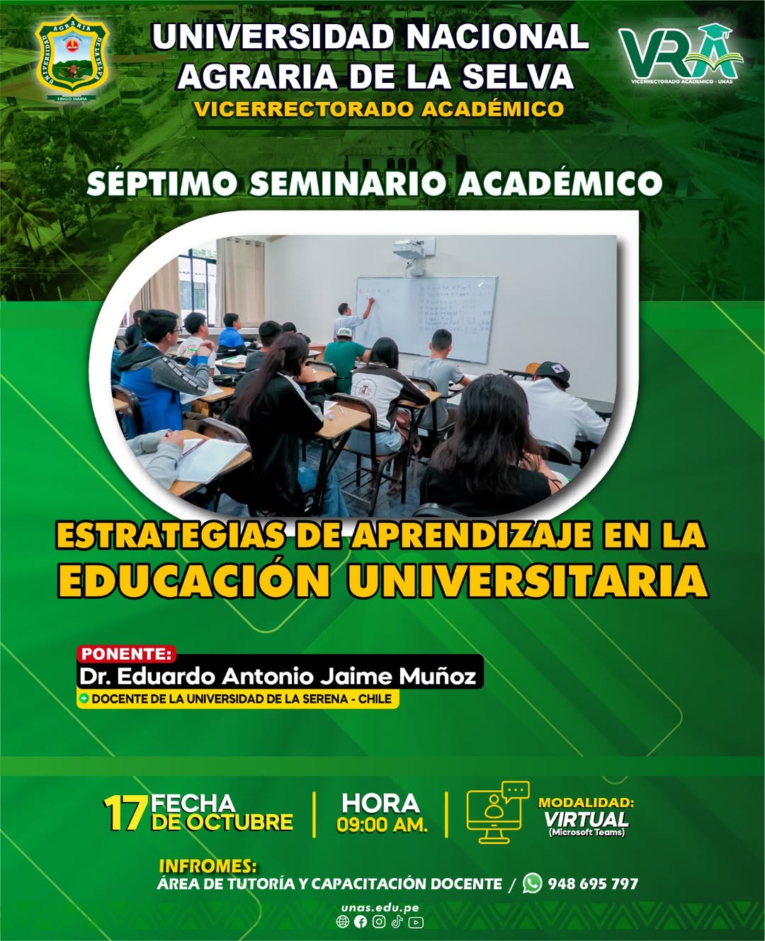 ✅ El Vicerrectorado Académico de la UNAS invita a la comunidad universitaria al Séptimo Seminario Académico: “Estrategias de aprendizaje en la educación universitaria”, un espacio para compartir conocimientos, experiencias y buenas prácticas que fortalecen la calidad educativa.