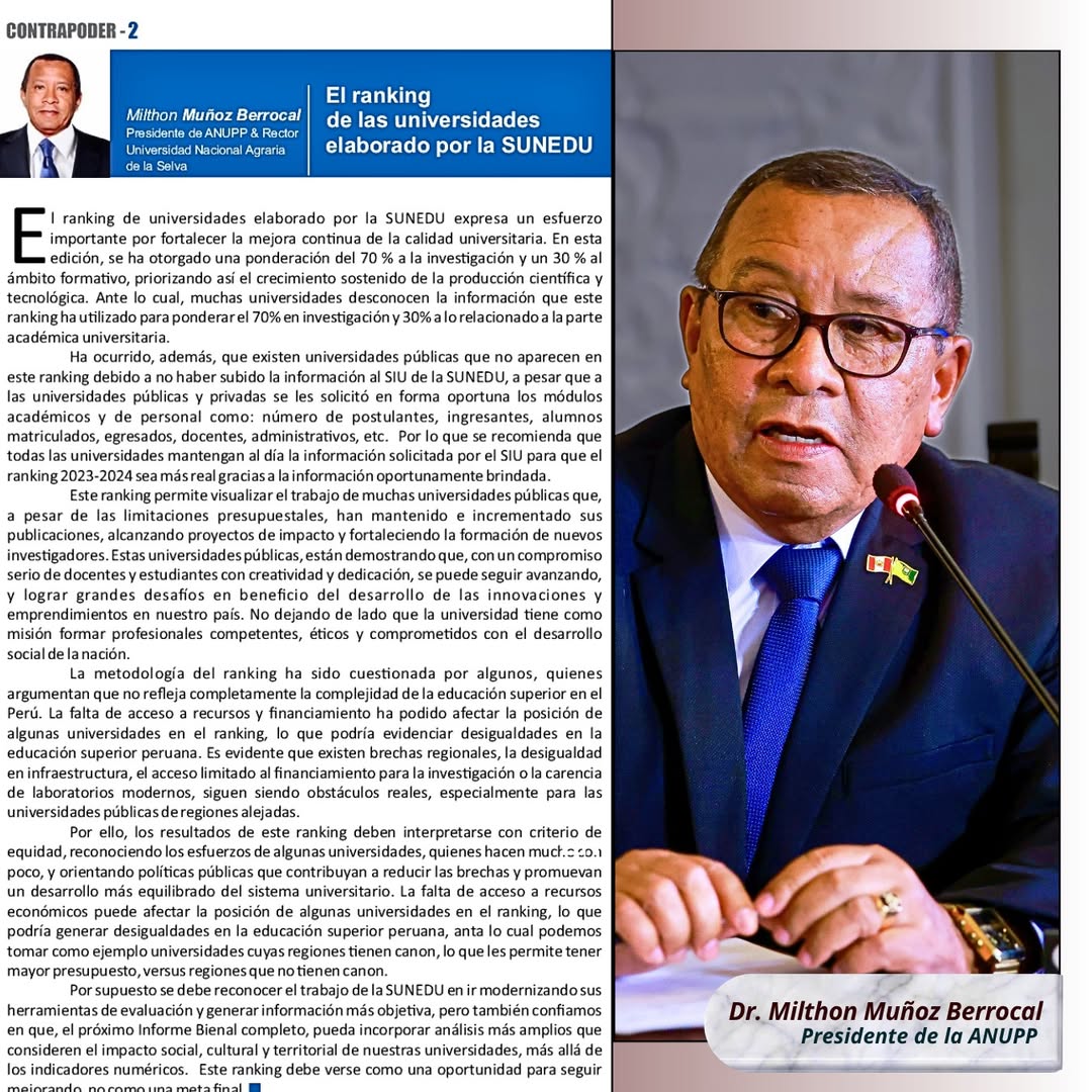 🟢En su reciente artículo, el Dr. Milthon Muñoz Berrocal, presidente de la Asociación Nacional de Universidades Públicas del Perú -ANUPP- y rector de la Universidad Nacional Agraria de la Selva- UNAS- ofrece un análisis crítico sobre los criterios y la metodología empleados por la Superintendencia Nacional de Educación Superior Universitaria -SUNEDU- en la elaboración de su ranking de universidades.