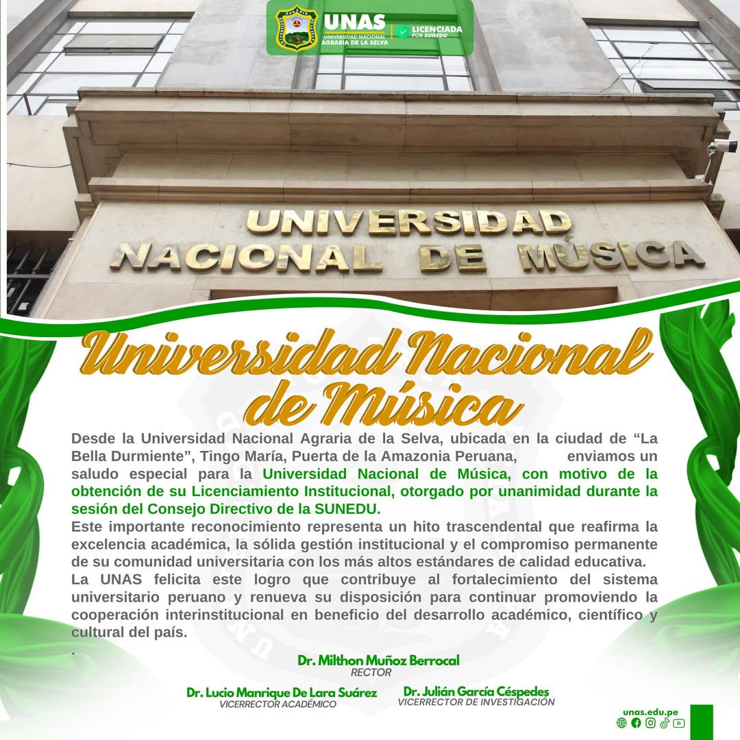 ๐ข Las autoridades universitarias de la Universidad Nacional Agraria de la Selva-UNAS, expresan su saludo a la Universidad Nacional de Mรบsica, con motivo de la obtenciรณn de su Licenciamiento Institucional, otorgado por unanimidad durante la sesiรณn del Consejo Directivo de la SUNEDU.