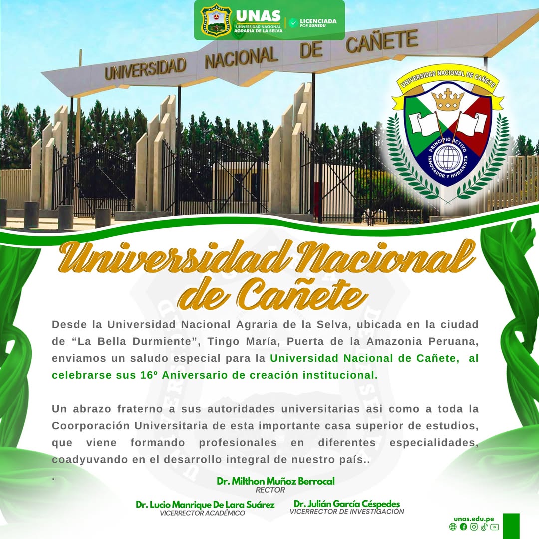 La Universidad Nacional Agraria de la Selva (UNAS) expresa su cordial saludo institucional con motivo del 15.º aniversario de la Universidad Nacional de Cañete, celebrado este 23 de noviembre.