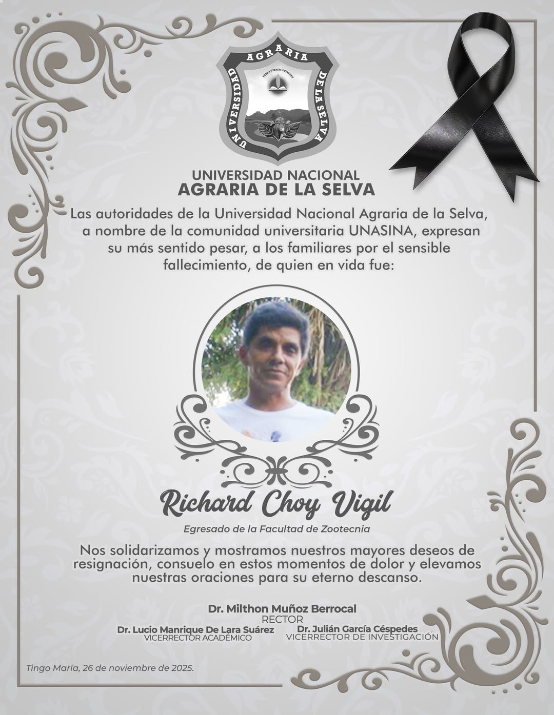 ๐ Las autoridades universitarias de la Universidad Nacional Agraria de la Selva, expresan sus mรกs sentidas condolencias a la familia de Richard Choy Vigil (Egresado de la Facultad de Zootecnia)