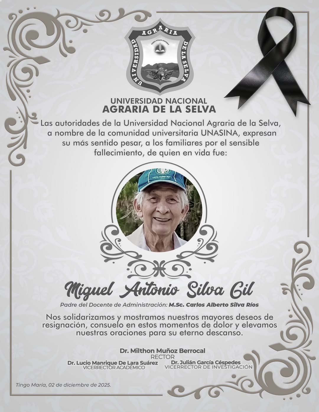 🕊 Las autoridades universitarias de la Universidad Nacional Agraria de la Selva, expresan sus más sentidas condolencias a la familia de Miguel Antonio Silva Gil (𝗣𝗮𝗱𝗿𝗲 𝗱𝗲𝗹 𝗱𝗼𝗰𝗲𝗻𝘁𝗲 𝗱𝗲 𝗔𝗱𝗺𝗶𝗻𝗶𝘀𝘁𝗿𝗮𝗰𝗶𝗼́𝗻: 𝗠.𝗦𝗰. 𝗖𝗮𝗿𝗹𝗼𝘀 𝗔𝗹𝗯𝗲𝗿𝘁𝗼 𝗦𝗶𝗹𝘃𝗮 𝗥𝗶𝗼𝘀)