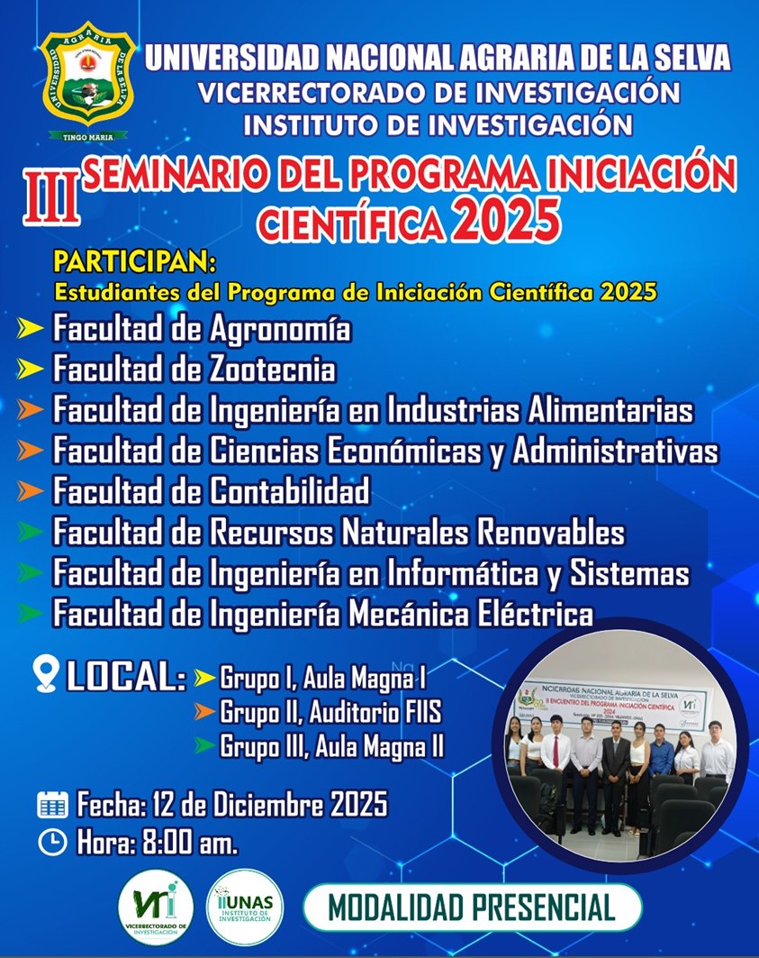 🟢La Universidad Nacional Agraria de la Selva (UNAS), a través del Vicerrectorado de Investigación y el Instituto de Investigación, anunció la realización del “III Seminario del Programa Iniciación Científica – 2025”, evento académico que se desarrollará el 12 de diciembre desde las 8:00 a. m., con el propósito de fomentar la vocación científica en los jóvenes universitarios.