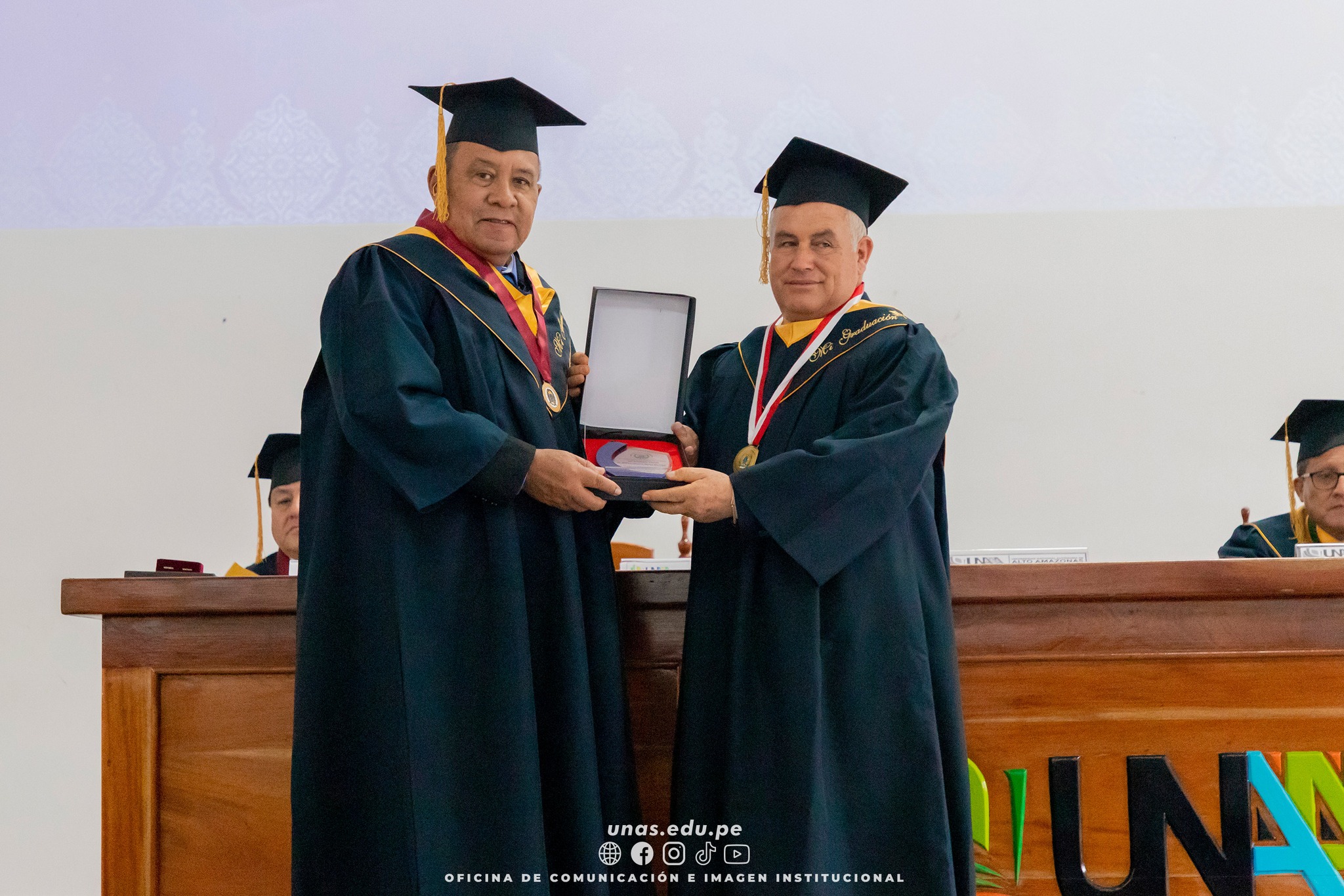 Durante la ceremonia protocolar, el Dr. Rosel Burga Cabrera tuvo a su cargo la imposición de la medalla honorÃfica, la entrega del diploma, la resolución correspondiente y una placa de reconocimiento, en un acto solemne realizado en el auditorio principal de la Universidad Nacional Autónoma de Alto Amazonas. ð¢ El evento contó con la presencia de docentes âalgunos de ellos egresados de la UNASâ, autoridades universitarias y estudiantes de la casa superior de estudios anfitriona.