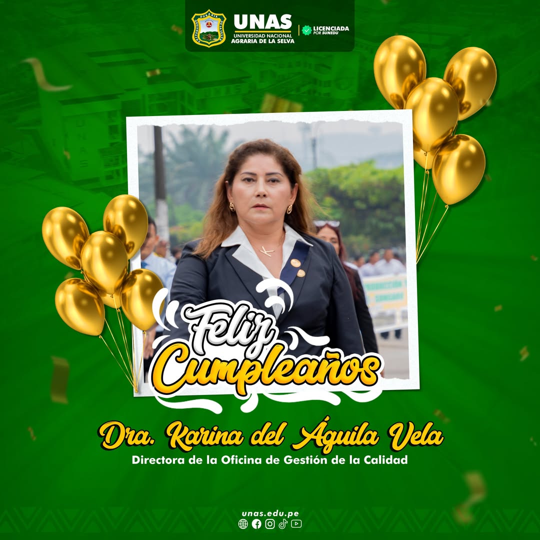 🔰 Las autoridades universitarias de la UNAS tienen el honor de extender las felicitaciones por el día de su cumpleaños a la Directora de la Oficina de Gestión de la Calidad, Dra. Karina del Águila Vela 🎊👏