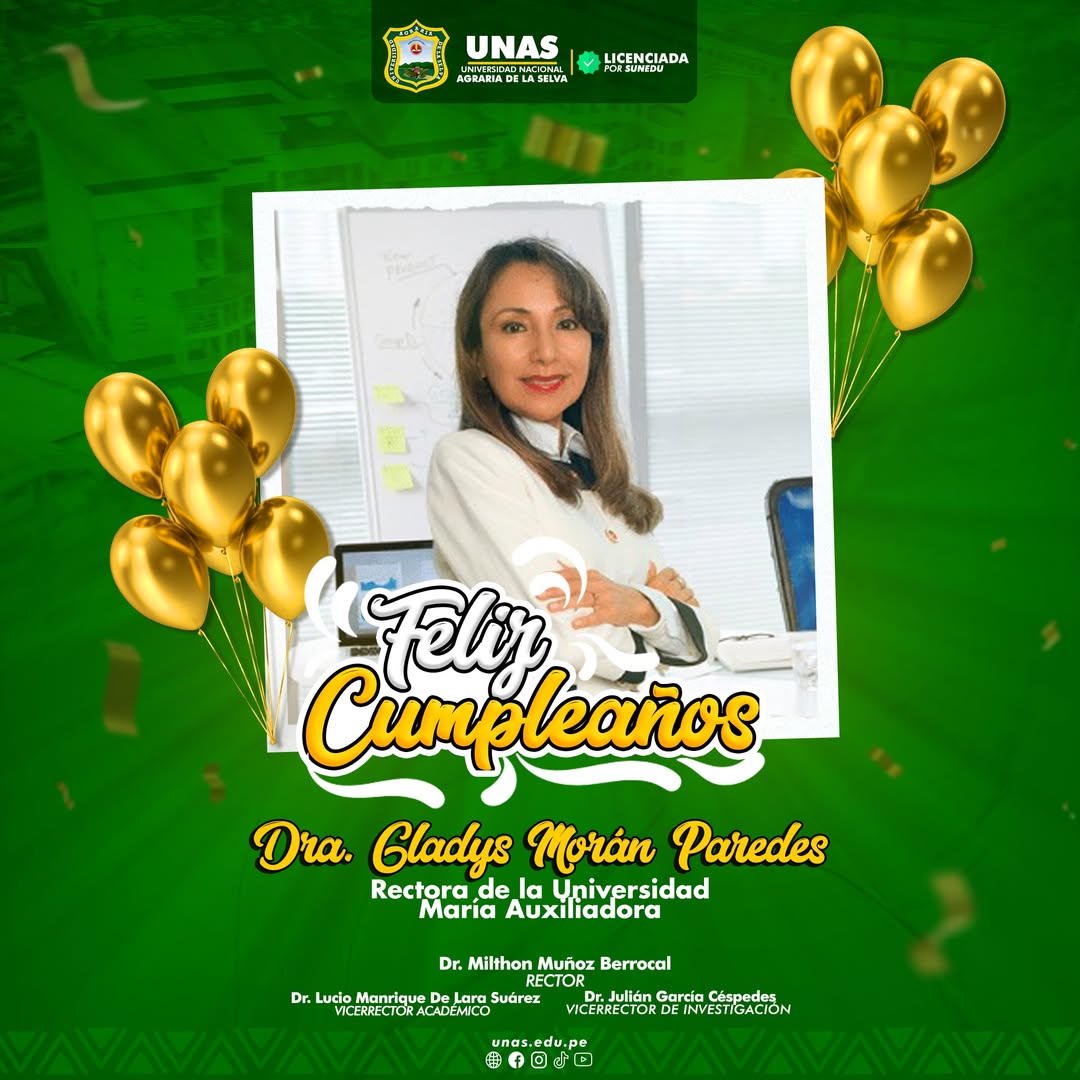 🔰 Las autoridades universitarias de la UNAS tienen el honor de extender las felicitaciones por el día de su cumpleaños a la Rectora de la UMA – Universidad María Auxiliadora, Dra. Gladys Morán Paredes 🎊👏