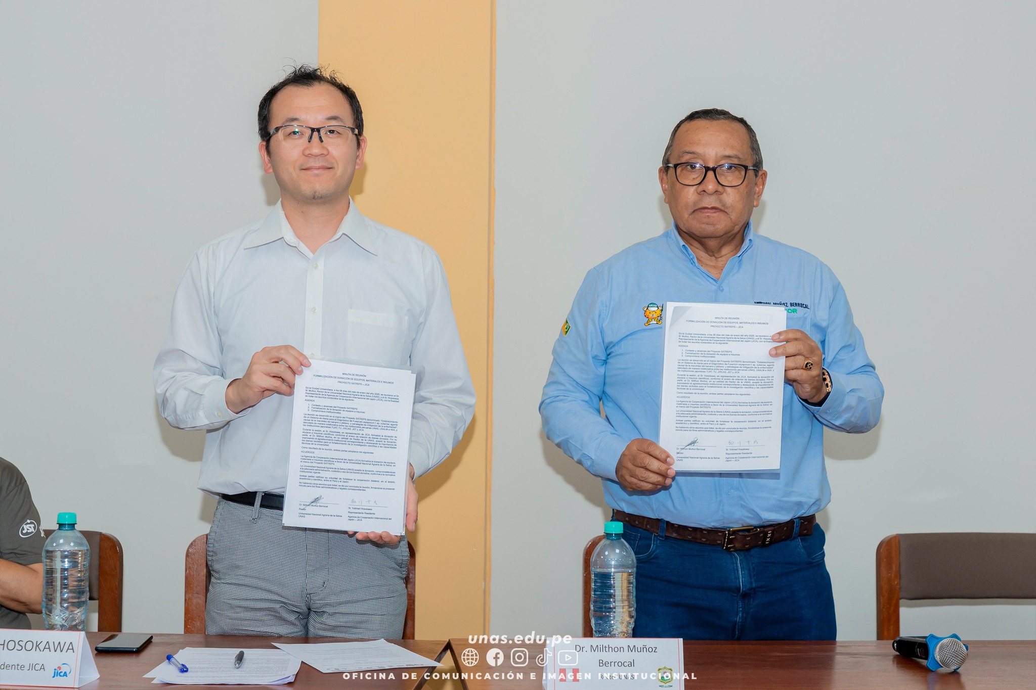 ๐ข El acto protocolar de formalizaciรณn de la donaciรณn se llevรณ a cabo en las instalaciones de la Oficina de Geomรกtica de la UNAS, donde el representante de JICA, Dr. Yukinari Hosokawa, y el rector de la UNAS, Dr. Milthon Muรฑoz Berrocal, suscribieron la minuta correspondiente, culminando asรญ el proceso de transferencia de los bienes del proyecto SATREPS-JICA.