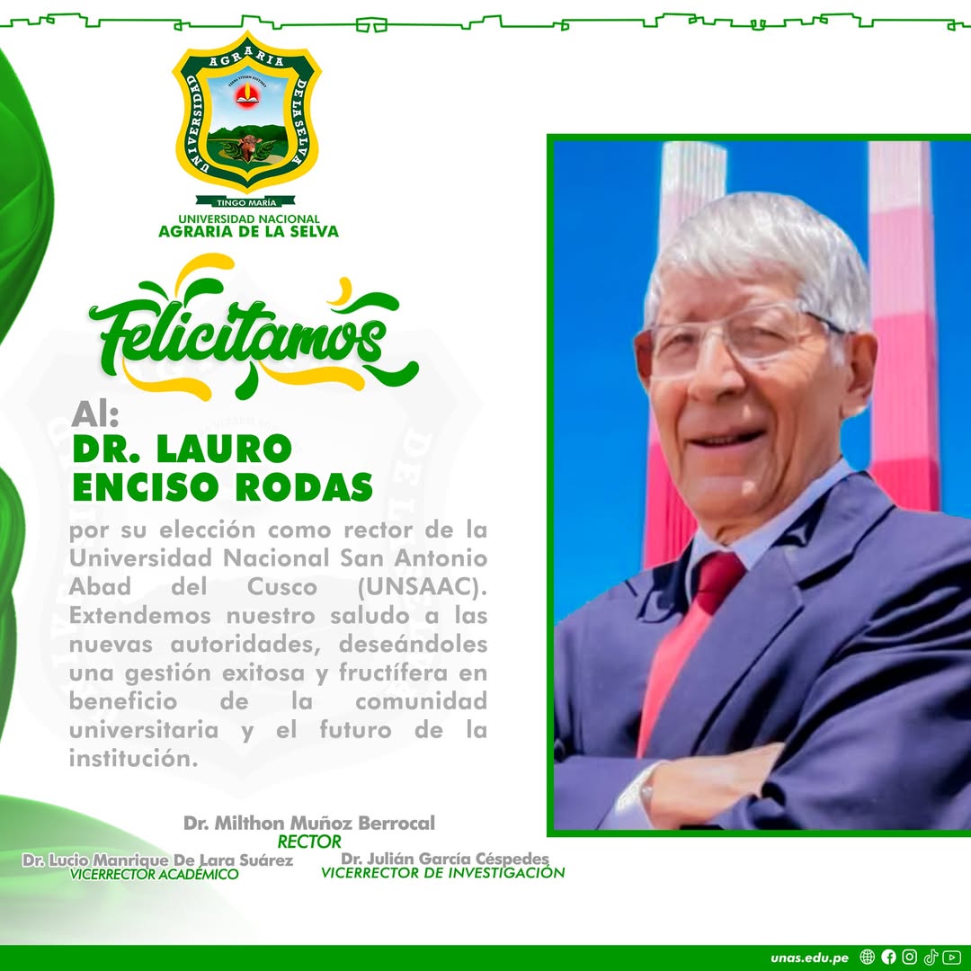 🟢 La Universidad Nacional Agraria de la Selva – UNAS, a través de sus autoridades, expresa un fraternal saludo y reconocimiento al Dr. Lauro Enciso Rodas, por su reciente elección como Rector de la Universidad Nacional de San Antonio Abad del Cusco – Página Oficial.