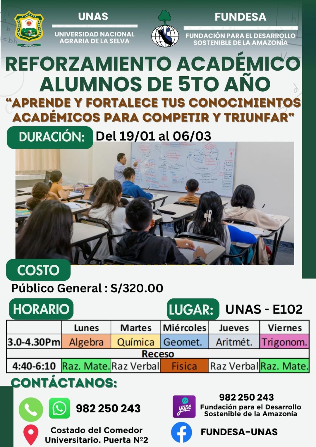 🟢La Universidad Nacional Agraria de la Selva -UNAS-, en alianza con la Fundación para el Desarrollo Sostenible de la Amazonía -FUNDESA-, presenta su Programa de Reforzamiento Académico, diseñado para fortalecer los conocimientos fundamentales de los estudiantes que se preparan para afrontar con éxito los retos académicos y los procesos de admisión a la educación superior.