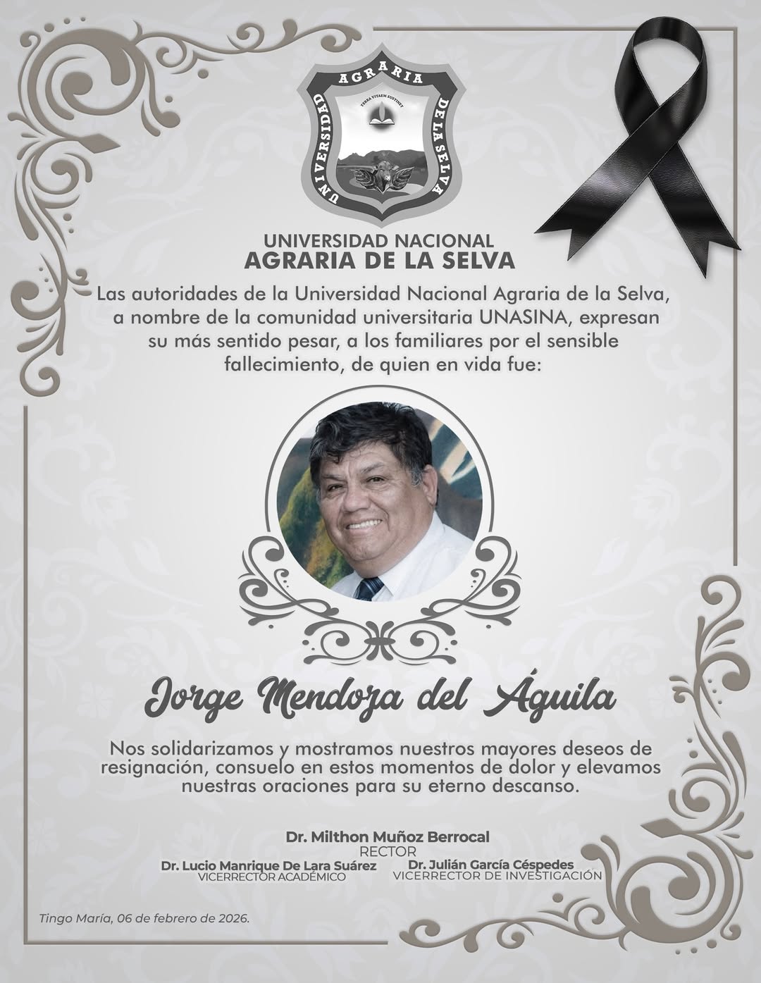 ๐ Las autoridades universitarias de la Universidad Nacional Agraria de la Selva, expresan sus mรกs sentidas condolencias a la familia de Jorge Mendoza del รguila.