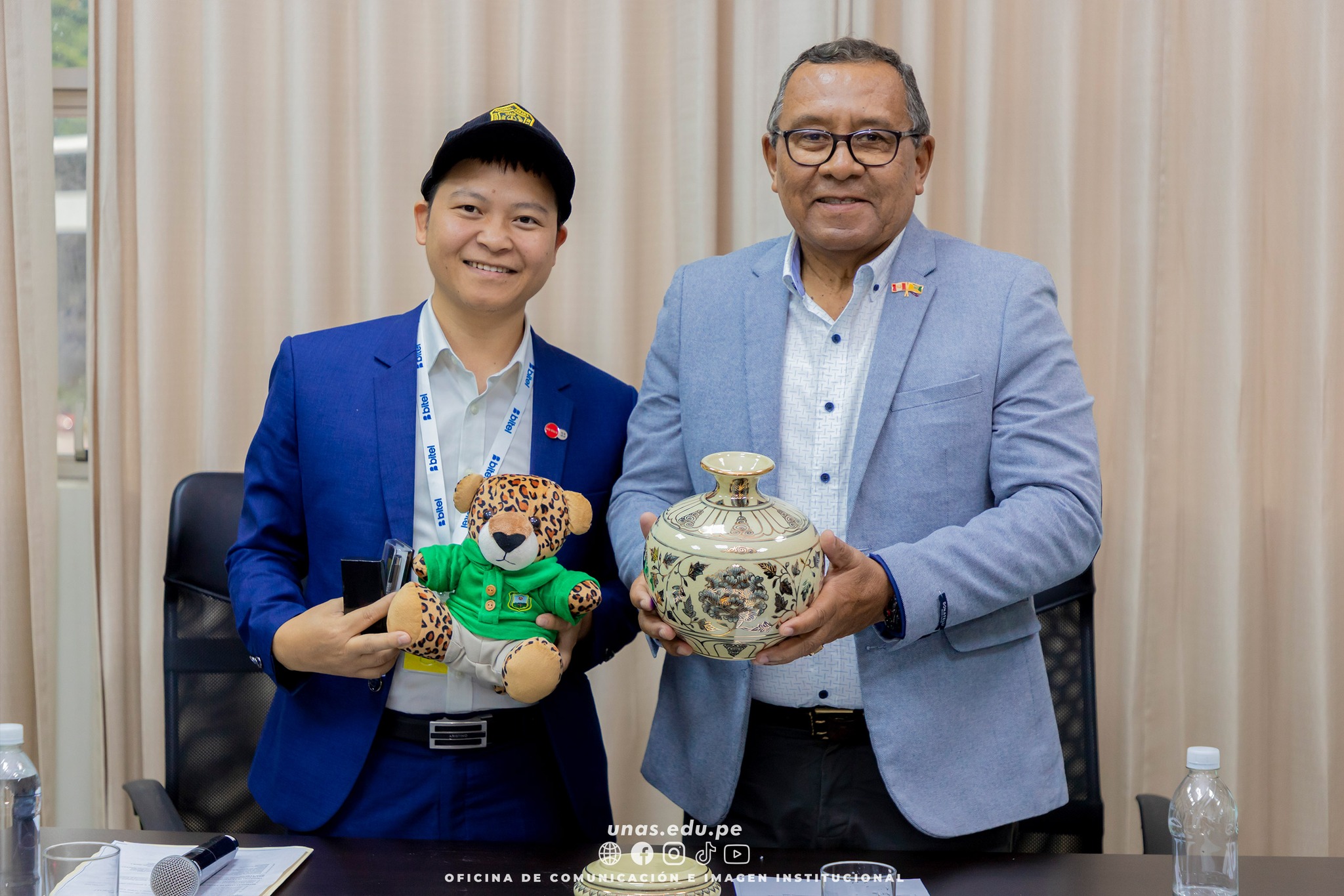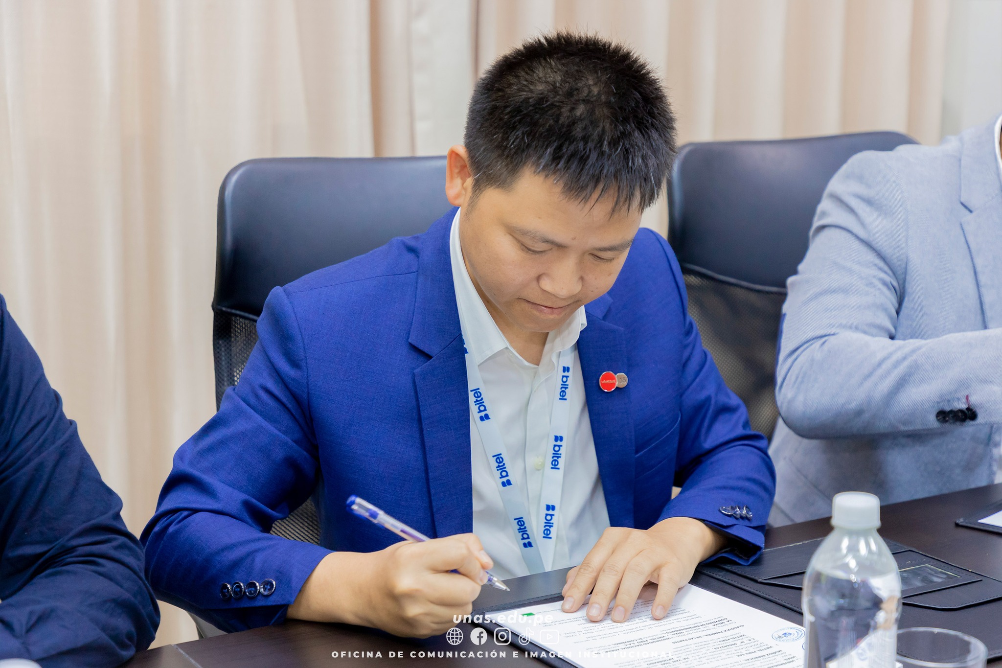 🟢 Durante la ceremonia estuvieron presentes, por parte de la UNAS, además del rector, el vicerrector de Investigación, Dr. Julián García Céspedes, y el director de Cooperación Internacional, Lic. Wilfredo Crispín Guillén. En representación de Bitel asistieron el Lic. Cristhian Ynocente Canchari, subdirector comercial de Huánuco, y el Lic. John Acosta Martel, subdirector de Servicios Digitales, ambos integrantes de la administración regional Huánuco.