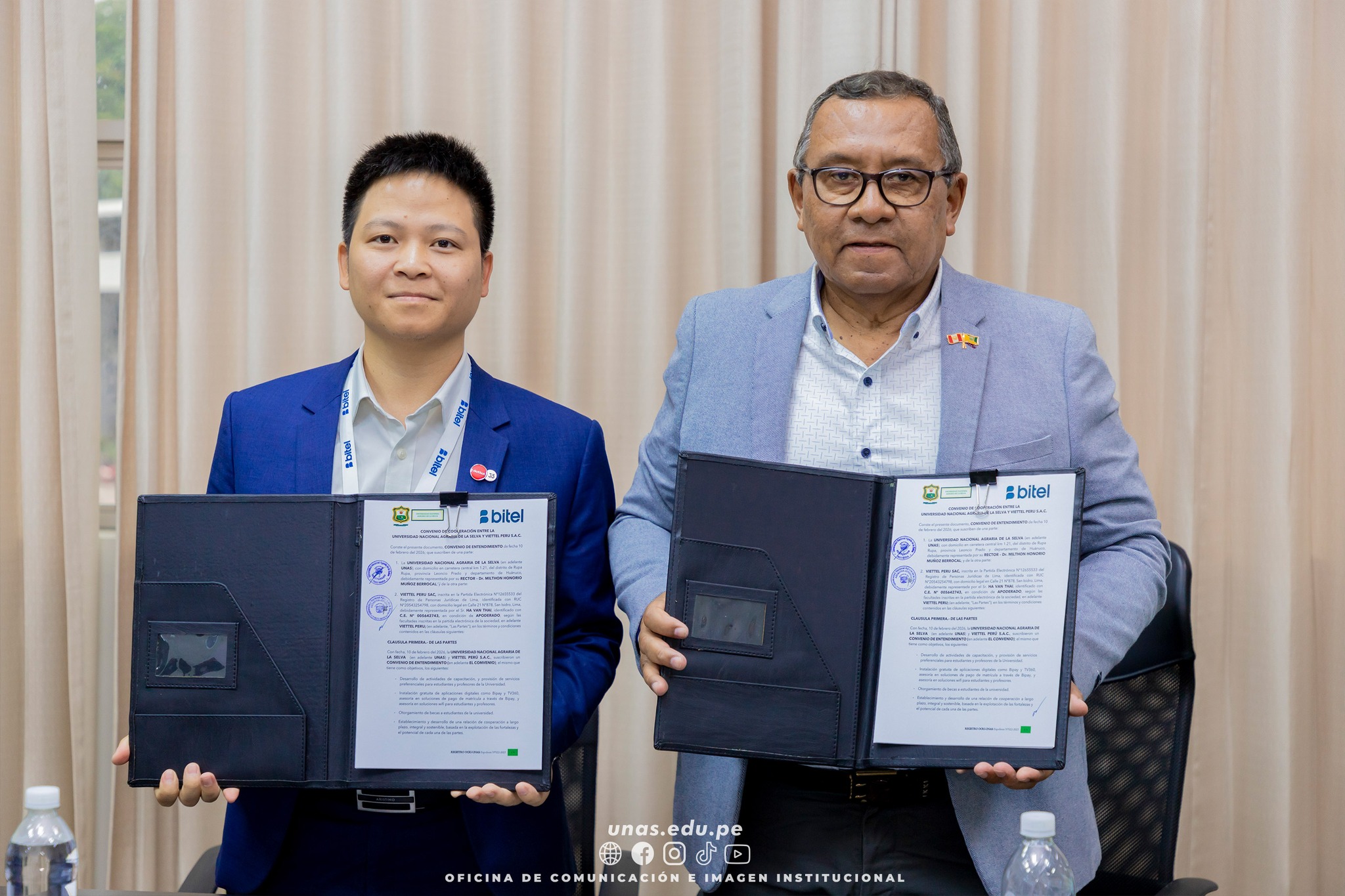 🟢 Con el objetivo de impulsar actividades de capacitación y brindar servicios preferenciales a estudiantes y docentes, la Universidad Nacional Agraria de la Selva -UNAS- suscribió un importante convenio de cooperación interinstitucional con la empresa de telecomunicaciones Bitel.