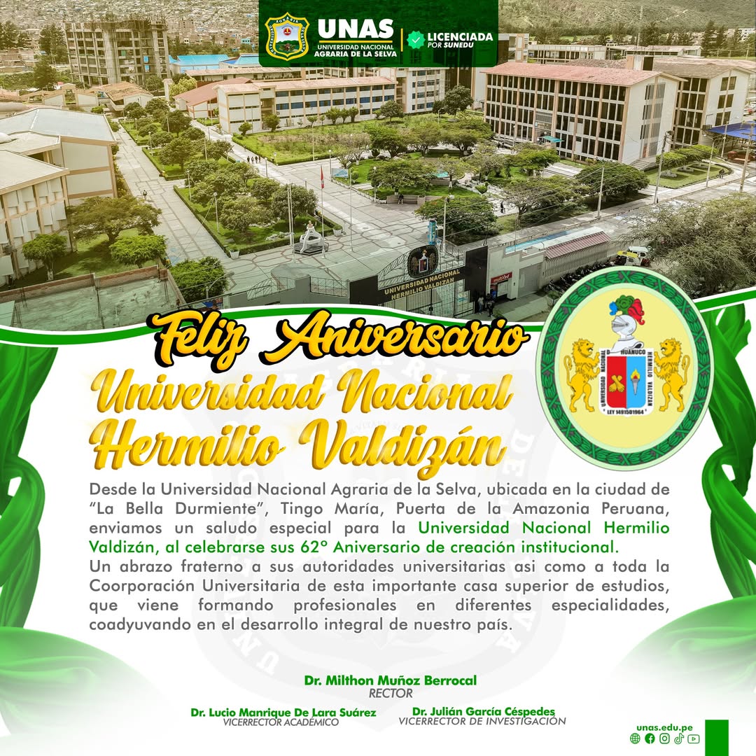 🟢 Las autoridades universitarias de la Universidad Nacional Agraria de la Selva (UNAS), expresan su saludo a la Universidad Nacional Hermilio Valdizán , por sus 62° años de creación institucional.