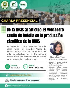 🔰 𝗖𝗛𝗔𝗥𝗟𝗔 𝗣𝗥𝗘𝗦𝗘𝗡𝗖𝗜𝗔𝗟 ✨📚 🟢 Tema: “De la tesis al artículo: El verdadero cuello de botella en la producción científica de la UNAS” 👩🔬 Ponente: Dra. Laura Faria – Doctora en Ciencias Biológicas, especialista en asesoría y gestión científica (I+D). 💻 Modalidad: Presencial 📅 Fecha: Jueves, 09 de octubre de 2025. ⏰ Hora: 9:00 a.m.