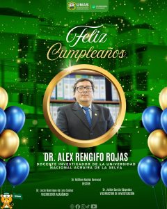 Las autoridades universitarias de la UNAS tienen el honor de extender las felicitaciones por el día de su #cumpleaños al docente Dr. Alex Rengifo Rojas 🎊👏 El Dr. Alex Rengifo Rojas ha contribuido activamente al fortalecimiento de la investigación científica en la UNAS, liderando proyectos sobre cambio climático, calidad del suelo, economía agrícola y valorización