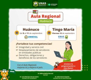 Llega el Aula Regional 2025 con actividades académicas presenciales y totalmente gratuitas 📚✨ 🗓 Del 8 al 12 de septiembre 📍 Organiza: ENAP – SERVIR, con el apoyo de la Universidad Nacional Hermilio Valdizán y de la Universidad Nacional Agraria de la Selva 👉 Habrá conferencias y seminarios especializados para fortalecer tu desarrollo profesional. 🔗